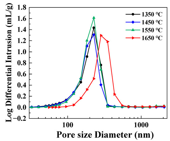 Pore-size distributions of the porous SiC ceramics sintered at different sintering temperatures.