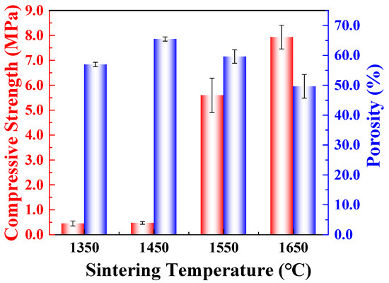 - Sintering temperature had a large influence on the shrinkage, porosity, and compressive strength of porous SiC ceramics. As the sintering temperature increased, the porosity decreased while the compressive strength improved. The porous SiC ceramic sintered at 1650 °C exhibited the most optimal compressive strength (7.9 MPa).