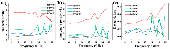Dielectric properties of the porous SiC ceramics sintered at different sintering temperatures: (a) real permittivity, (b) imaginary permittivity, and (c) dielectric loss.
