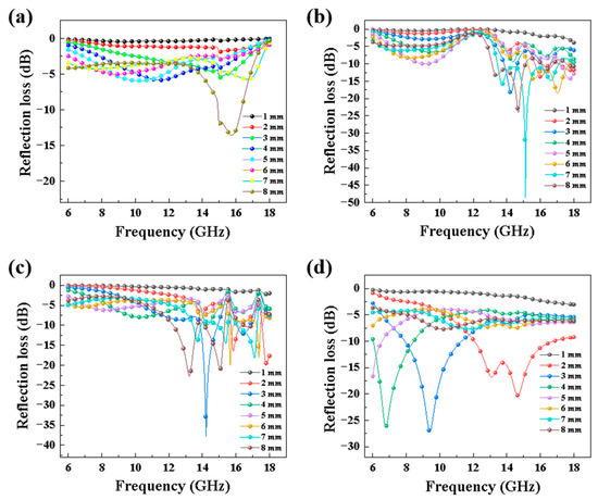 Reflection loss with different thicknesses of the porous SiC ceramics sintered at (a) 1350 °C, (b) 1450 °C, (c) 1550 °C, and (d) 1650 °C.