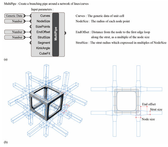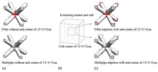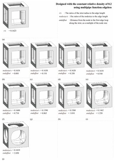 - Methodologies and frameworks for design optimization were established to achieve optimized edgeless lattice structures assisted by the lattice structure generator plugin for Rhinoceros, which is called the KCL lattice structure generator. The results were achieved by: (i) introducing the derivation of the representative relative density of the edgeless unit cell by extracting the central unit cell from the {3 × 3 × 3} ea arranged lattice structure; (ii) introducing fillet edgeless function by design variable parameters (i.e., the ratio of the fillet radius to the strut radius (); (iii) introducing multipipe edgeless function by design variable parameters (i.e., the ratio of the node size to the edge length () and ); and (iv) introducing a new method for evaluating the degree of stress concentration by the number of meshes subjected to stress, which corresponds to the top 10% of the von Mises stress distribution.