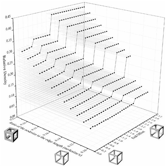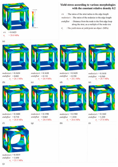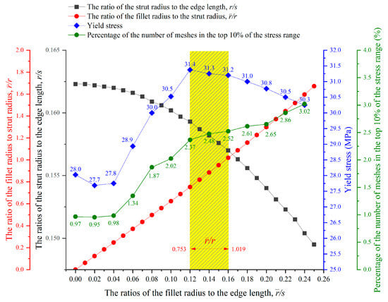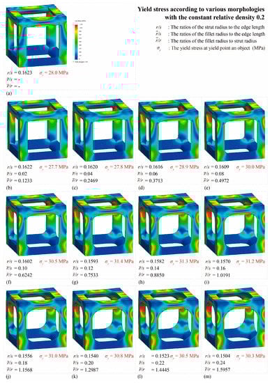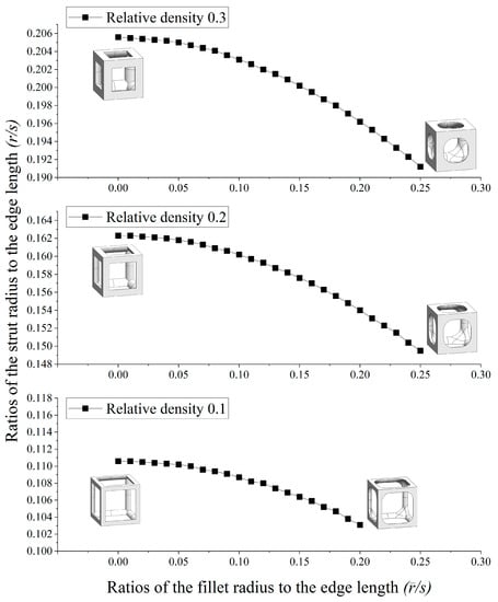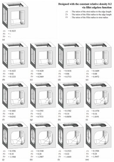 | Design Parameters for Fillet Edgeless Simple Cubic with a Relative Density of 0.2 | Results of FEA | |||||