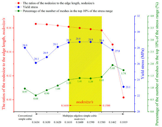 - Through nonlinear static FEA, it was confirmed that the optimized multipipe edgeless simple cubic unit cell improved the properties of yield stress and stress concentration. In the optimized multipipe edgeless parameters presented in this study, the yield stress of multipipe edgeless simple cubic unit cell with 0.1610 ≤ ≤ 1.1580 was improved by approximately 2.9% compared to that of the conventional simple cubic unit cell. However, it was observed that the improvement was less effective than the fillet edgeless function.