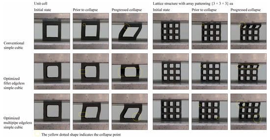 - The experimental compressive tests confirmed that the introduction of edgeless functions to lattice structures improved their compressive strength. The optimized fillet edgeless simple cubic structure showed the most significant improvement compared to conventional simple cubic and multipipe edgeless structures. The results of the compressive strength tests were consistent with the FEA results, and initial fractures occurred at stress concentration locations derived from FEA. However, further FEA and experimental tests are needed to study the detailed deformation beyond the elastic region into the plastic region and final fracture.