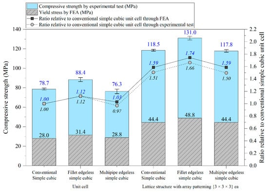 | Yield Stress by FEA (MPa) | Ratio Relative to Conventional Simple Cubic Unit Cell | Compressive Strength by Experimental Test (MPa) | Ratio Relative to Conventional Simple Cubic Unit Cell | ||