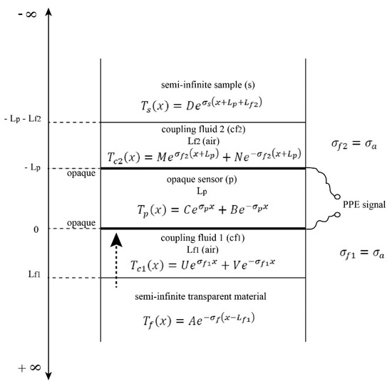 In order to obtain the PPE signal, one must solve the classical system of heat diffusion equations with particular conditions of continuity for temperature and heat flux at interfaces, as requested by the configuration described in Figure 1. The calculations are standard [3,4,5,6], and we will herein present only the particularities connected with the new configuration.