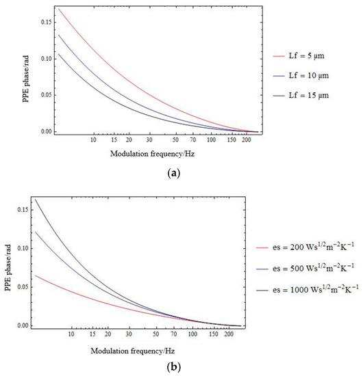 Mathematical simulations for the phase of the PPE signal as described by Equation (6), for (a) es = 500 Ws½m−2K−1 and air gap thickness Lf2 = 5 µm; 10 µm; 15 µm; and (b) Lf2 = 10 µm and es = 200 Ws½m−2K−1; 500 Ws½m−2K−1; 1000 Ws½m−2K−1.