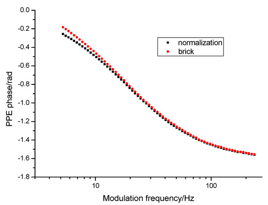 Figure 3 displays a typical measurement performed for a brick sample over a large frequency range. The behavior of the phase of the FPPE signal for the sample (brick) and for normalization are displayed. The behavior of the normalized phase is obtained by the difference of the two curves.