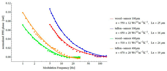 The values of the thermal effusivity of wood and Teflon, obtained for the two sensor’s thicknesses, are in good agreement, and they are also in agreement with literature data (600–740 Ws½m−2K−1for Teflon [5,18,19] and 470–679 Ws½m−2K−1 for wood [18,19], respectively). However, for further investigations, we selected the 100 µm thick LiTaO3 sensor mainly because it allows measurements in a higher frequency range. Sometimes, samples, such as pressed powders, cannot be obtained with large enough thicknesses, and consequently, the theoretical request of a thermally thick sample cannot be satisfied at low frequencies.