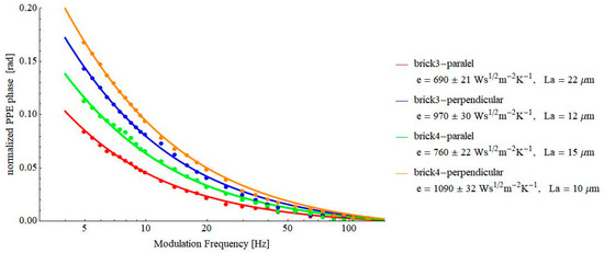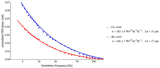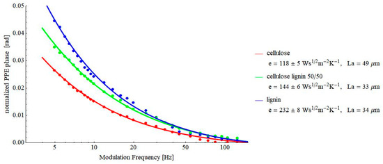 Figure 8 and Figure 9 contain the results obtained on some pressed powders (cellulose–lignin mixtures and soot-based materials, respectively). These materials were selected for investigations because they constitute another example of porous solids. At the same time, a lot of air is incorporated into their structure, and consequently, the value of the thermal effusivity is rather low, testing the limits of the proposed PPE method. As a result of Figure 7, Figure 8 and Figure 9, values of thermal effusivity in the range of 118–246 Ws½m−2K−1 have been obtained. As a comparison, Sanja et al. reported values of thermal effusivity of cellulose knitted fabrics in the range 80–120 Ws½m−2K−1 [23], but, of course, these values depend on the granulation of powders, the pressure used for obtaining the pills, etc.