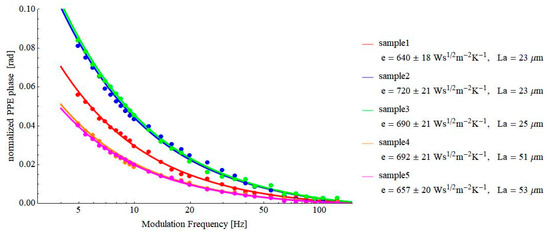 The experimental setup was typical for PPE experiments [5,6,10]. The radiation source was a 100 mW YAG laser. The modulation frequency range (5–250 Hz) and the diameter of the laser beam (8 mm) were selected to assure the approximation for one-directional propagation of heat through the detection cell. The pyroelectric sensor was 15 × 15 mm2 area LiTaO3 single crystals (400 µm and 100 µm thick and provided with Cr-Au electrodes on both sides). The semi-infinite transparent window in front of the sensor was a 5 mm thick quartz glass, transparent in both visible and near-infrared (NIR). In such a way, any additional heat source generated in the window by the absorption of the IR radiation emitted by the heated sensor’s surface is eliminated. An SR-830 lock-in amplifier was used for data acquisition, and a PC was used for data processing. The measurement consisted, in fact, of a scan of the phase of the FPPE signal as a function of the modulation frequency. The information is collected from the phase of the signal (and not from the amplitude) because, as mentioned before, the phase is less noisy than the amplitude of the signal. All the measurements have been performed at room temperature, and the S/N ratio for all the measurements was better than 100. The uncertainties in the thermal effusivities were calculated from the RMS deviation of the measured data compared with the fitting curve. They are generally in the range of 2.5–3%. The uncertainties in La were always lower than 1 µm.
