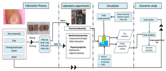 The study investigated the efficacy of clay bricks with pomegranate peel waste (PPW) incorporated into the external walls in the present climate of the new city of Aswan. Specifically, there were four fundamental stages to the study. As can be seen in Table 1, the first phase included the creation of brick samples with differing percentages of pomegranate peel waste at a temperature of 900 °C. Following this, the second step involves conducting the testing of brick samples for their mechanical, physical, and thermal characteristics. In the third step, Design Builder simulation software was used to determine what further energy was saved by using the different brick samples. In the last stage, the financial viability of construction using pomegranate peel trash was examined. A flowchart of the methods used in this investigation is shown in Figure 1.