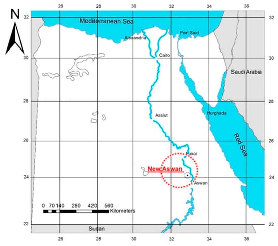 This study focused on a hot, dry climate because of the region’s increasing energy demands for cooling and the limits of current climate solutions. Homeowners and others who build their own houses sometimes neglect insulation in Egypt [,,]. Government-built buildings often have their roofs but not their walls insulated. The study set out to determine whether using clay bricks composed of pomegranate waste would improve thermal performance and reduce energy consumption in the proposed new city of Aswan. Located in the western Nile Valley, about 10 km from the present-day city of Aswan, New Aswan is easily accessible (as depicted in Figure 2). It has the characteristic hot desert climate of Egypt, with summer highs exceeding 45 °C and winter lows below 15 °C. May and June have the lowest relative humidity (12%), while December and January have the highest (36% and 34%, respectively) [].