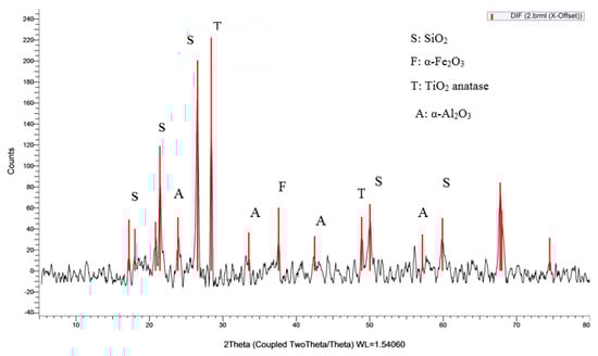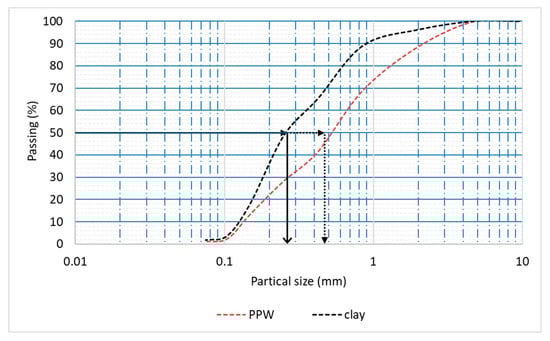 Clay was used as the primary brick component in this study. Table 2 displays the results of X-ray fluorescence (XRF) analysis on the clay. As can be seen in Figure 3, the dominant mineral phase of the clay was determined with the use of X-ray diffraction (XRD). Analysis by X-ray diffraction indicates that kaolin predominates among the minerals in the combination. PPW is collected from local juice shops. It is dried under normal sunlight. It is then milled to obtain fine particle powder. The powder was washed with water to remove any undesirable dust and dried in an oven at 100 °C for two days to obtain fully dried powder before being mixed with clay. The XRF of PPW is listed in Table 2. Because of its high organic content, PPW has a greater LOI. The particle size analysis of clay and PPW is shown in Figure 4; the average diameter of the clay particles was 0.27 mm, while the PPW particles were 0.47 mm in diameter.