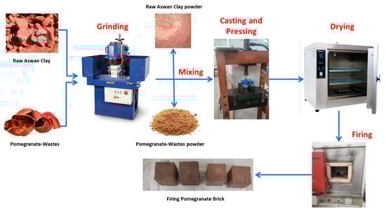 A ball mill was used to finely grind the derided PPW and mix it with clay at different percentages (0%, 5%, 7.5%, 10%, and 15%). The different mixed formulations were blended together for two minutes to obtain a consistent dry mixture. The added water to prepare the paste is 20 wt.% based on the mixtures. The formed pastes were pressed into 50 mm cubic molds. After filling the molds with the mixture, they were compressed at three intervals to remove any remaining air bubbles. After 24 h of air drying, the samples were removed and dried at 120 °C for 6 h. The dried samples are fired at 900 °C for 4 h at 10 °C/min heating rate. The low heating rate is to avoid the rapid escape of CO2 and H2O during the firing process. The brick preparation procedure was presented in Figure 5.