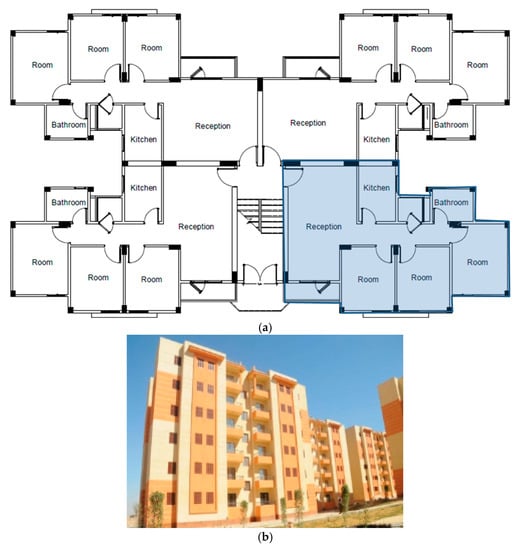 The building was established as a replica of a residence located in New Aswan City. Due to its location within the public housing complex, this building was chosen despite its lack of consideration for local climate and its use of insulation methods other than roof insulation. Each apartment is around 86 m2 in area, and the entire building, including the stairwell, is about 357 m2 in the area as shown in Figure 6. There are six stories and four apartments on each floor. There was 3 m between the floor and ceiling, and the ratio of windows to walls was roughly 10% of the total façade area.