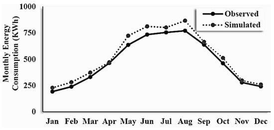 In accordance with ASHRAE Guideline 14-2002, the findings of the simulation were validated by modeling the required parameters of the research site. These factors included comfort zone limitations, illumination, building materials, and heating, ventilation, and air conditioning (HVAC) configurations. In order to accurately depict the overall energy consumption of all of the apartments in the building, the electricity bills from the apartment on the third level were used to make a comparison between the findings of the simulation and the actual energy usage. It was found that the results of energy simulations had an inaccuracy of 10.19%, as shown in Figure 8, and there was a correlation coefficient of 0.995 between the simulated values and the real values that were observed.