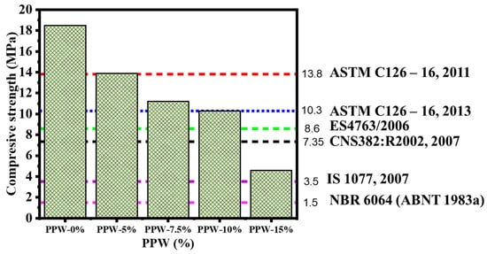 Fabricated lightweight-fired bricks were tested for their compressive strength, and the findings are shown in Figure 9. Adding PPW lowered the compressive strength of the burnt clay at 900 °C from 18.5 MPa to 13.9, 11.2, 10.3, and 4.6 MPa when PPW-5%, PPW-7.5%, PPW-10%, and PPW-15% were added, respectively. This could be due to the formation of porous resulted from the PPW combustion. The samples that have been fired at 800 °C from 700 °C showed lower compressive strength compared to the samples fired at 900 °C. There has been a lot of research showing that as combustion temperatures rise, the density of the brick structure improves, and hence the compressive strength of fried bricks []. Furthermore, increase in the temperature leads to formation of glass phase from SiO2, which leads to eliminate the formed pores. The compressive strength of brick specimens for engineering applications ranges between 5 and 8 MPa [,,]. According to various international building standards. All of the fabricated bricks in this investigation had greater compressive strength and were in accordance with international building standards. All fabricated bricks agree with the Brazilian Standard NBR 6064 (ABNT 1983a) [], Indian Standard (IS 1077, 2007) [], Chinese National Standard (CNS382:R2002, 2007) [], and the Egyptian Standard (ES4763/2006) [], while the samples composed of PPW-0%, PPW-5%, and PPW-7.5% agreement only with ASTM C62–13a, 2013 [].