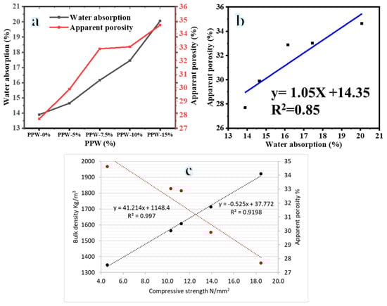 Effect of PPW addition on water absorption and apparent porosity (a), relationship between Water absorption and apparent porosity (b), and relationship between compressive strength, density, and porosity (c) of fired bricks at 900 °C with PPW waste additive.