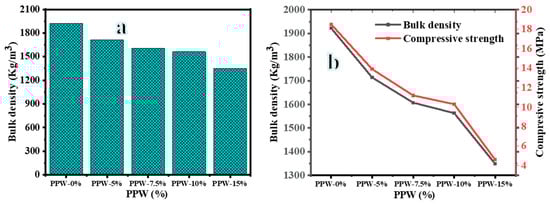 In the same manner of compressive strength, the brick samples containing PPW have a lower density than PPW-0% brick samples. As shown in Figure 11a, as the PPW percentage increased the bulk density decreased. This is due to eliminating the organic materials and mineral hydrates or carbonates in PPW that are decomposed at the suggested fired temperature, producing in an increase in pore size, and hence a reduction in density. When the fire temperatures were decreased from 900 °C to 700 °C, there was little change in the bulk density of the lightweight bricks was observed. The increase in the fire temperature leads to an increase in the bulk density. If the brick’s bulk density is less than 1680 kg/m3, as specified by the ASTM C90 standard [], then it is called lightweight. Figure 11b shows the decreased bulk density and compressive strength with an increase in the PPW percentage.