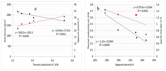 The study outcomes indicate that the best results were obtained when the manufactured bricks were fired at 900 °C, so the study investigated the thermal conductivity of all samples that have been fired at this temperature. (Conventional brick, PPW-5%, PPW-7.5%, PPW-10% and PPW-15%), and the results were as shown in Table 4, where the thermal conductivity decreases with increasing the proportion of pomegranate peel waste in the sample. The lower thermal conductivity of bricks may be due to the increased porosity and decreased density of the specimens with PPW. There is a linear relationship between thermal conductivity, porosity, and density of manufactured brick specimens, as shown in Figure 12a. The thermal performance of bricks with PPW can be predicted using this relationship. All the samples have thermal conductivities that are lower than those of conventional bricks. Thus, PPW bricks can be utilized in masonry structures, which will lead to the construction of green, low-energy buildings. Poor energy transfer and increased heat resistance are the direct consequence of the brick’s matrix developing larger pores as a result of increasing amounts of additives being added in. The specimen’s thermal resistance and thermal insulating characteristics, as measured by the reduction in thermal conductivity and the increase in specific heat capacity, improve with increasing porosity as PPW additive amounts are raised. This explanation is consistent with experimental results showing a rather high correlation coefficient between porosity level and the sample’s insulating capabilities as depicted in Figure 12b.