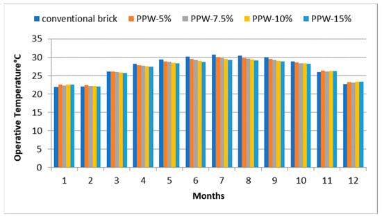 The thermal performance of PPW samples was evaluated using Design-Builder and compared to the thermal performance of conventional brick by calculating the operative temperature, which indicated an interior thermal comfort index that reflected the blending of air temperature influences. As depicted in Figure 13, the findings indicate that the operative temperatures of the brick samples varied. Throughout most of the year, the operative temperature drops since the percentage of pomegranate peel waste in the bricks increases. However, during the winter months, the temperature rises, perhaps due to a reduction in the thermal conductivity of the bricks. In July, the hottest month of the year in Aswan, the findings indicated that the temperature difference between PPW-15% bricks and conventional bricks was 1.47 K. During the same month, samples PPW-5%, PPW-7.5%, and PPW-10% recorded 0.71, 0.98, and 1.26 K, respectively. Throughout the rest of the year, the temperature decrease varied between 0.9 and 1 K.