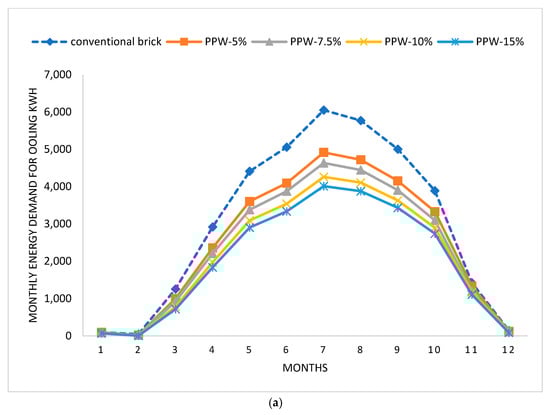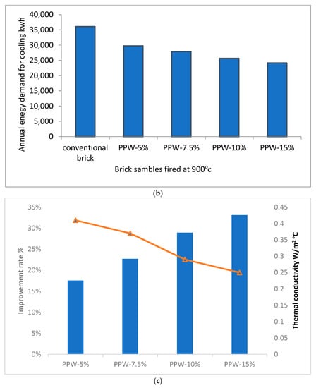 Figure 14a shows that the summer months of April through October had the highest monthly variation in energy use across all assessed brick samples. In addition, the conventional brick represents the worst-case situation in terms of cooling energy usage. Each brick manufactured from pomegranate peel waste requires substantially less cooling energy than conventional bricks. July, the hottest month of the year, is the month in which cooling energy consumption reaches its highest level. During this time of year, Aswan may reach temperatures over 45 °C. Figure 14b,c show that when conventional bricks are replaced with a PPW-15% brick sample, the building’s cooling needs decrease by 11,946.1 kWh, representing an improvement rate of about 33.13% compared to the base scenario (conventional brick). PPW-10% decreased the amount of energy used for cooling by 10,437.2 kWh, or an improvement of 28.95%. PPW-7.5% and PPW-5% have the ability to reduce cooling energy consumption by 8192.44 kwh and 6327.34 kwh, respectively, with corresponding improvement rates of 22.72% and 17.50%. Considering that space cooling contributes 37–42% of a building’s total energy requirement [,], this will greatly lower the building’s energy consumption.