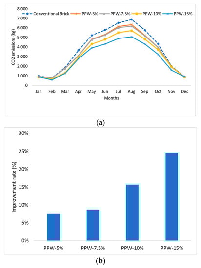 The simulation results for the proposed fabricated clay brick incorporating pomegranate peel waste in terms of; (a) monthly CO2 emissions, (b) the improvement rate.