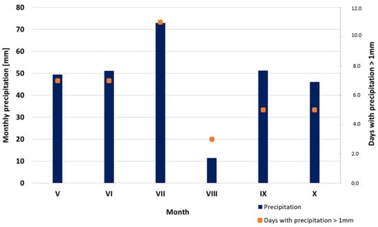 The average daily temperatures in the test period ranged from 5.1 to 25.9 °C (May–October 2018). Total monthly precipitation ranged from 11.4 mm in August to 72.9 mm in July (Figure 1). During the test period, 38 days with rainfall exceeding 1.0 mm were noted. The highest total monthly precipitation (72.9 mm) was observed in July, and the lowest one, in August (11.4 mm). During the test period, the average temperature was 16.6 °C, which exceeds the long-term average (1971–2000) by 1.7 °C. The total rainfall was 282.1 mm, which is 86.8 mm lower than the average annual rainfall (1971–2000) [37,76].
