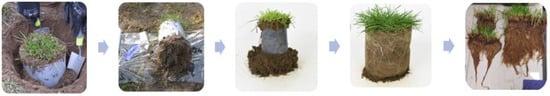 The tests were conducted from May to October 2018. Each type of BioWAG and the control site were installed in 9 iterations. Samples were placed at random, so as to eliminate the influence of threshold conditions. All sites were regularly irrigated until grass sprouted and rooted (approx. 2–3 weeks after sowing). The same doses of irrigation were used at each site in order to ensure comparable vegetation conditions. After that time, no additional irrigation was conducted until the end of the vegetation season, so the amount of water stored in the BioWAGs depended on atmospheric conditions. The condition and growth of plants were regularly monitored by controlling fresh and dry weight, and the water balance of plants. In order to assess the root systems of plants, after the end of the vegetation season, roots, protected with plastic sheaths, were collected from the test sites (surface area: 0.0314 m2; height: 0.20 m). Samples were additionally protected with foil and transported to the laboratory in intact condition. After taking photographs for documentation and collecting the BioWAGs for further analyses, the root mass was soaked in water to remove soil particles (Figure 2). The cleaned root systems of grass were subjected to biometric analyses.