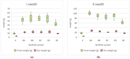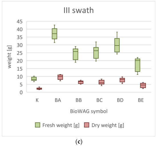 Influence of BioWAGs on the growth of above-ground biomass and dry above-ground mass. (a) Growth of fresh and dry grass after the first swath, (b) growth of fresh and dry grass after the second swath, and (c) growth of fresh and dry grass after the third swath. The diagrams show the first and third quartiles, medians, and minimum and maximum values.