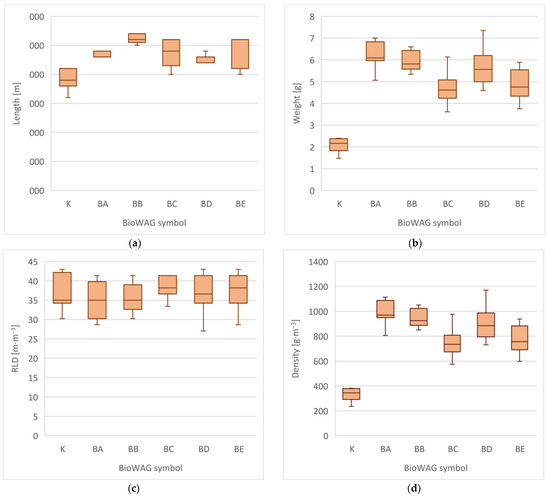 Biometric measurements of grass root system noted after the vegetation season (2018), depending on the type of BioWAG used: (a) length of the root system; (b) total weight of the root system; (c) values of the RLD index measured in reference to the total length of the root system; (d) total density of the root system. The diagrams show the first and third quartiles, medians, and minimum and maximum values.