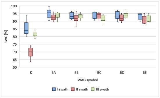 The influence of WAGs on relative water content (RWC). The diagram shows the first and third quartiles, medians, and minimum and maximum values.