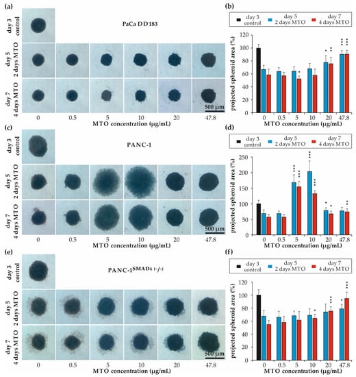 Compared with the size of untreated spheroids at days 5 and 7, treatment with 20 µg/mL and 47.8 µg/mL MTO resulted in a significant concentration-dependent increase in the size of PaCa DD183 and PANC-1SMAD4 (−/−) spheroids, indicating an effect on cell cohesion at higher MTO concentrations (Figure 2a,b,e,f). Interestingly, the size of PANC-1 spheroids increased sharply at already 5 µg/mL and 10 µg/mL MTO, whereas the increase was less pronounced after incubation with 20 µg/mL and 47.8 g/mL MTO, indicating a very rapid cell death at MTO concentrations of 20 µg/mL or higher (Figure 2c,d).
