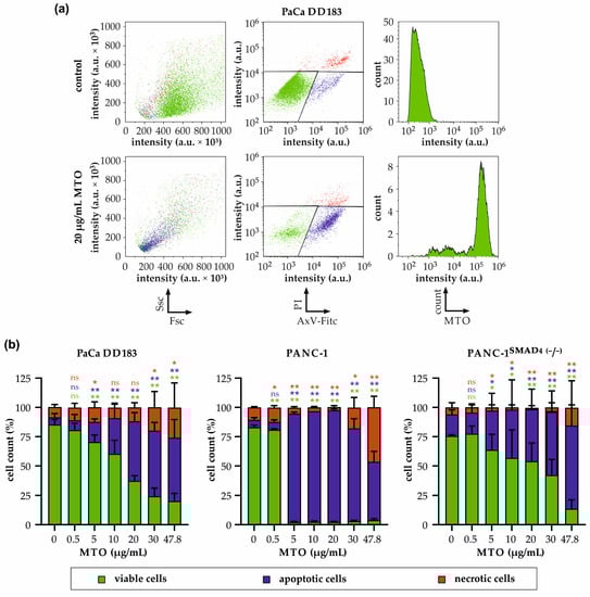 The applied gating function, shown exemplarily for PaCa DD183 cells in Figure 3a, was used to analyze cell morphology, phosphatidylserine exposure and plasma membrane integrity and MTO uptake into the cells. PaCa DD183 cell spheroids revealed a dose-dependent increase in apoptotic and necrotic cells with increasing MTO concentrations. At the highest MTO concentration (47.8 µg/mL), the number of viable cells decreased to 20.1 ± 6.7% (Figure 3b). In contrast to PaCa-DD183, the sensitivity of PANC-1 cell spheroids against MTO was much more pronounced. A concentration of 5 µg/mL reduced the viability to 2.2 ± 0.7%, compared to 70.4 ± 6.0% in PaCa DD183 cells. Thereby, the percentage of apoptotic cells increased to 92.4 ± 1.3%, while PaCa DD183 cells only 17.2 ± 2.5% apoptotic cells in the presence of 5 µL/mL MTO. Interestingly, PANC-1 cells with a mutated SMAD4 gene were much less sensitive to MTO compared to the original PANC-1 cells. Thus, the use of 5 µg/mL MTO resulted in only 33.4 ± 14.8% apoptotic and 2.8 ± 2.3% necrotic cells, and only at the highest MTO concentration (47.8 µg/mL), the cells reached approximately the same values that were already reached in the PANC-1 cells at 5 µg/mL.