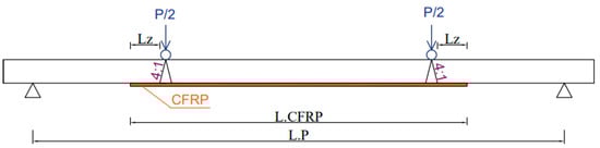 In the case of studies devoted to the correct anchoring length of composite tapes, a number of studies regarding the reinforcement of concrete or reinforced concrete structures [5,6,7,8,9] and few studies devoted to the study of the optimal anchoring length of composite tapes in bridge [10] or hot-rolled steel structures [11,12,13,14] have been found. The following conclusions appeared in the above-mentioned literature items: the authors of the paper [12] showed that nearly 98% of the load value is transferred by the composite tape to the steel element on the last 10 cm of the tape length, which allows for the conclusion that 100 mm can be assumed as the effective length of the tape anchoring; in the paper [13], it was found that on the basis of the CHS (Circular Hollow Section) steel cross-section tests, the effective anchoring length can be assumed as 75 mm, while in the paper [10] on the basis of the study of steel bending elements, the authors assumed an effective anchoring length of 203 mm. In the paper [10], the authors defined the effective anchoring length of composite tapes as the minimum length that allows the transfer of the maximum load by composite tapes. According to this definition, a diagram (Figure 1) appeared in the work [14], which was also used in this work to determine the anchorage length (Lz). In Figure 1, LCFRP is the total length of the composite tape, and LP is the span in the axes of the supports.