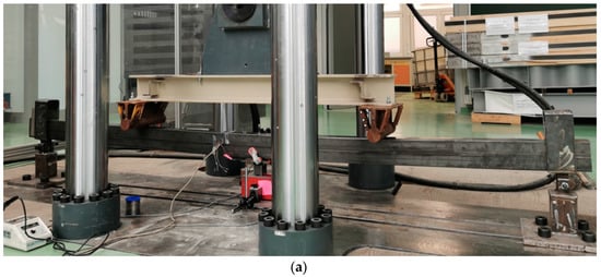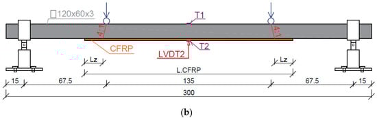 Thin-walled steel beams were matted on the surface of the lower flanges and degreased, and CFRP tapes were glued. The beams were stored under laboratory conditions and tested after 28 days in a ZwickRoell (ZwickRoell GmbH & Co. KG, Ulm, Germany) testing machine in a four-point bending scheme. This time (28 days) was required in furtherance of achieving the full strength of the bonded joint. During the tests, the load increase was obtained by the movement of the press piston. The piston speed was assumed to be 1 mm/min, and the force value was measured in intervals of 0.01 s. In the entire cycle of laboratory tests, the deflection of the tested beams was measured using the LVDT2 inductive sensor located in the middle of the beam span, and the strain using two electrofusion strain gauges (with detailed parameters—TENMEX TFs-10 120 Ω ± 0.2%—marked in Figure 3 as T1 and T2) located in the middle of the upper and lower flanges in the middle of the beam span. The photo of the test stand and the scheme of the laboratory stand are presented in Figure 3.