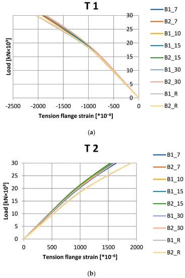 In laboratory tests, an LVDT2 inductive sensor was used to measure the vertical deflection of the beams, whereas strains in the compression and tension flanges were measured using T1 and T2 electrofusion strain gauges. The results are presented in the graphs in Figure 4. The presentation of the results was limited to a load of 30 kN because, at a load value of 30.4 kN, tape detachment was observed in one of the tested beams.