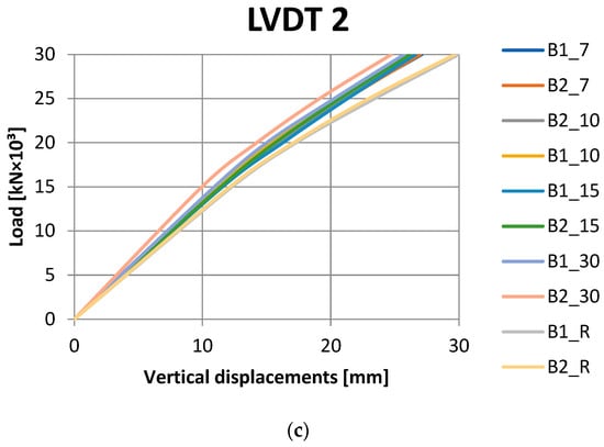 During numerical analyses, a number of numerical models were developed, differing in the length of the CFRP tape. The individual numerical models were named in relation to the corresponding beams tested in the laboratory, adding the letter ‘a’ at the end: B_7a, B_10a, B_15a, B_30a and B_Ra. The detailed results of laboratory tests carried out were highly consistent with the results obtained from numerical analyses, as shown in Figure 7, adding for comparison the results obtained in laboratory tests by the reference beam B1_R and the reinforced beam B1_7. Furthermore, the behavior of the beam during laboratory tests is consistent with that obtained from numerical analyses (Figure 8).