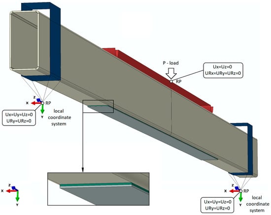 The boundary conditions were reflected adequately for actual research. The boundary conditions were defined using contact interactions between the steel beam and the supports and the loading element (where contact in the normal and tangential directions was considered with a friction coefficient of 0.2). Moreover, in the case of models reinforced with composite tape, the composite tape was connected to the adhering layer, while the adhesive was connected to the underside of the steel profile, using a Tie interaction. Within the elements representing the loading element and the supports, special reference points were defined, where the necessary degrees of freedom were defined, as shown in Figure 5.