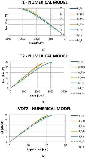 Results of numerical analyses: (a) strain values at the T1 strain gauge location, (b) strain values at the T2 strain gauge location, (c) displacement values at the LVDT2 sensor measurement location.