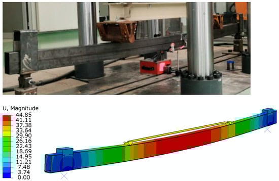 Numerical simulations were performed using the Abaqus® software (2022, Dassault Systemes Simulia Corporation, Velizy Villacoublay, France). In the case of numerical simulations, the use of the finite element method (FEM) allowed for the development of five numerical models representing experimental research conducted in parallel. The first model represented a numerical model where there was a steel beam unreinforced with composite tapes, which was supported on supports and loaded with a loading component. The other four numerical models constituted a modification of the basic model, where each model used a reinforcement of the steel reference beam through the use of composite strips with different lengths, which were directly bonded to the beam (to the underside of the steel profile). The aforementioned models differed only in the length of the composite strips used, where the lengths were, respectively, 155, 161, 171 and 201 cm. During the FEA analysis, it was possible to compare the effect of the length of the bonded composite tapes, which was used to reinforce the profile of the steel beam and relate the results to the unreinforced beam.