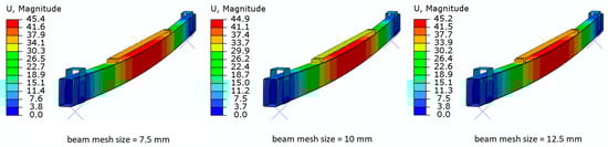 In addition, the effect of mesh density on the results of numerical calculations was verified within the framework of FEM simulations (as shown in Figure 9 in the example of the comparison of displacement levels). As a result, the selected mesh size of 10 mm in the case of the beam was the optimal mesh, and the results for this mesh were the closest in relation to experimental studies, both in terms of deformations, loads at which rupture of the composite tapes was registered, etc. A mesh with a lower density, e.g., 7.5 mm, and a higher density, e.g., 12.5 mm, showed larger deviations.