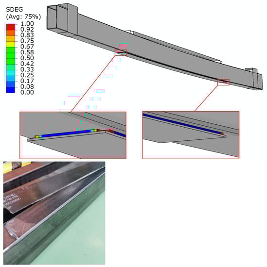 During the laboratory tests, the value of the load was recorded at which the complete detachment of the composite tape from the surface of the steel beam took place. For some of the beams, detachment occurred along the entire length of the tape, while for others, it occurred on one half only. During numerical analyses, the load was recorded at the moment of the first damage to the adhesive layer. The load values are presented in Table 4. The damage of the glued joint during laboratory tests and numerical analyses is shown in Figure 10.