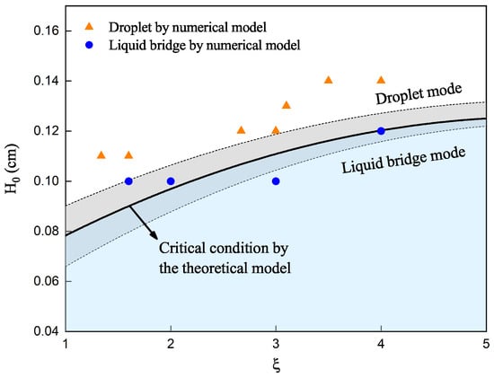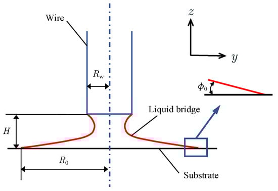 In the proposed model, above, a liquid bridge is assumed to form between the wire and the substrate. However, as the distance between the wire and the substrate increases, the liquid bridge mode will transition to the droplet mode. Algorithm 1 is used to determine the height of the liquid bridge. The critical condition for the transition to the droplet mode can be expressed as follows.