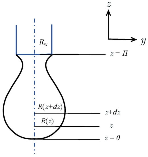 Figure 2. The shape of the liquid bridge is mainly dominated by surface tension, gravity, and pressure. To describe the continuous liquid bridge, let us first assume that the input power of the arc is sufficient to melt the feed wire into liquid completely. Meanwhile, the shape of the liquid bridge is considered to be axisymmetric. As the Marangoni force acts mainly in the tangential direction, its effect on the liquid bridge profile is exerted indirectly, by influencing the flow velocity, which is ignored here. The pinch effect caused by the magnetic field is not considered. As a result, the surface tension in the normal direction mainly determines the profile. The profile can thus be described by the Young–Laplace equation [