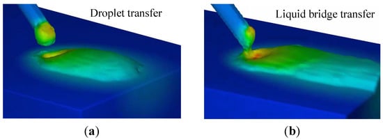 In WAAM, the liquid metal transfer mode plays an important role in the melt track’s morphology and the component’s fabrication quality. The three types of transfer mode, droplet, liquid bridge, and wire stubbing, are illustrated in