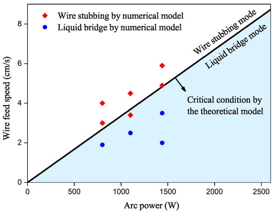 20], the solid wire fails to completely melt before entering the melt pool, leading to severe disturbance to the melt pool. Generally, the liquid bridge mode is most favorable, while the other two modes, especially the wire stubbing mode, need to be avoided. The following section will analyze the liquid bridge mode and determine the critical conditions for its transformation into the droplet and the wire stubbing modes.