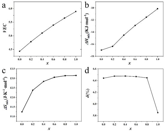 Variation in (a)VEC; (b) mixing enthalpy ΔHmix; (c) mixing entropy ΔSmix; (d) atomic size difference δ versus Cu content x(x = 0, 0.2, 0.4, 0.6, 0.8, 1) calculated for the AlCrTiV0.5Cux lightweight HEAs.