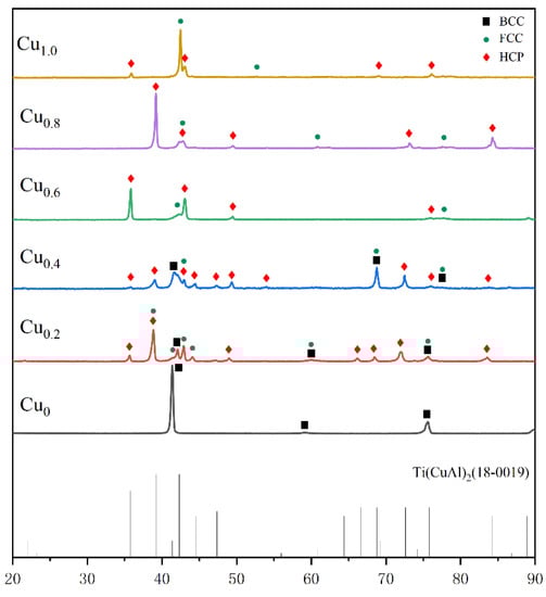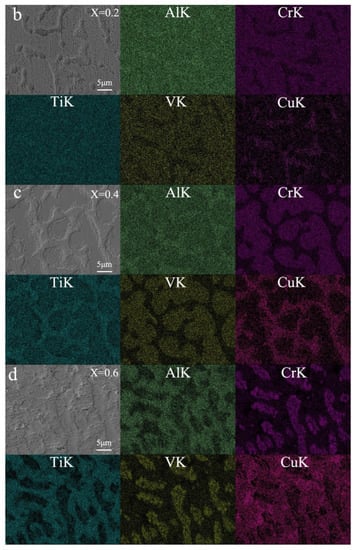 Cu has a positive binary enthalpy of mixing and relatively high valence electron concentration (VEC) with other constitutional elements. Figure 1 shows that the mixing enthalpy, VE, and mixing entropy ΔSmix of the AlCrTiV0.5Cux HEAs increased with the increase in Cu content, while the atomic size difference δ decreased with Cu addition. Hence, the microstructure and phase stability of AlCrTiV0.5Cux HEAs may vary with the composition. Cu tends to segregate out of the matrix due to a positive binary enthalpy of mixing of Cu with other constitutional elements. The AlCrTiV0.5Cux HEAs have a relatively large atomic size difference. Based on the solid-solution phase formation rules of high entropy alloys [28], there are probably ordered phases such as intermetallic compounds in the matrix. According to the VEC criterion [29], the phase composition of AlCrTiV0.5 is mainly BCC phase. The content of FCC phase increases with the addition of Cu, and AlCrTiV0.5Cu is mainly FCC phase. Figure 2 shows XRD patterns of AlCrTiV0.5Cux samples. In summary, with the addition of Cu, the phase composition of AlCrTiV0.5Cux HEAs may gradually change from BCC phase to FCC phase, and there may be intermetallic compounds. The segregation of Cu between grains increases with the copper content.